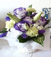 【お悔やみ・お供えの花】アレンジメント(青・紫)XSサイズ お悔やみ(故人への感謝)カード