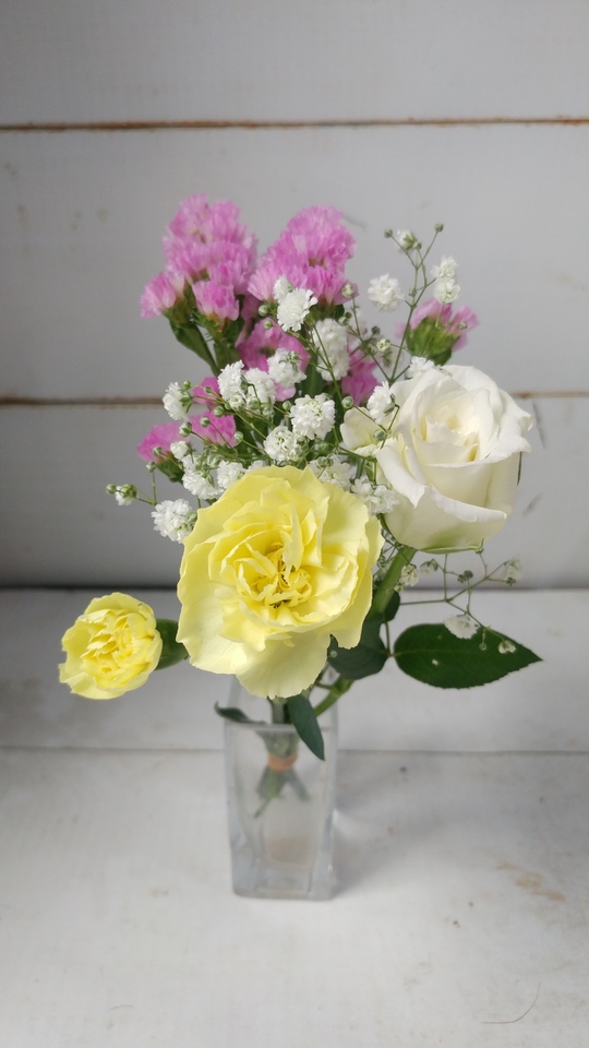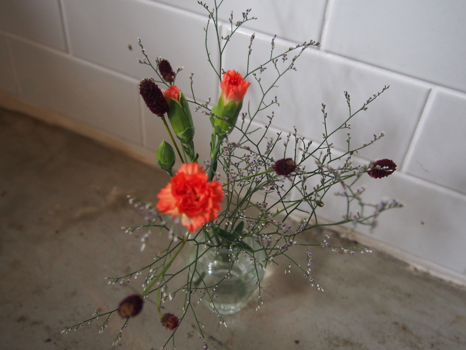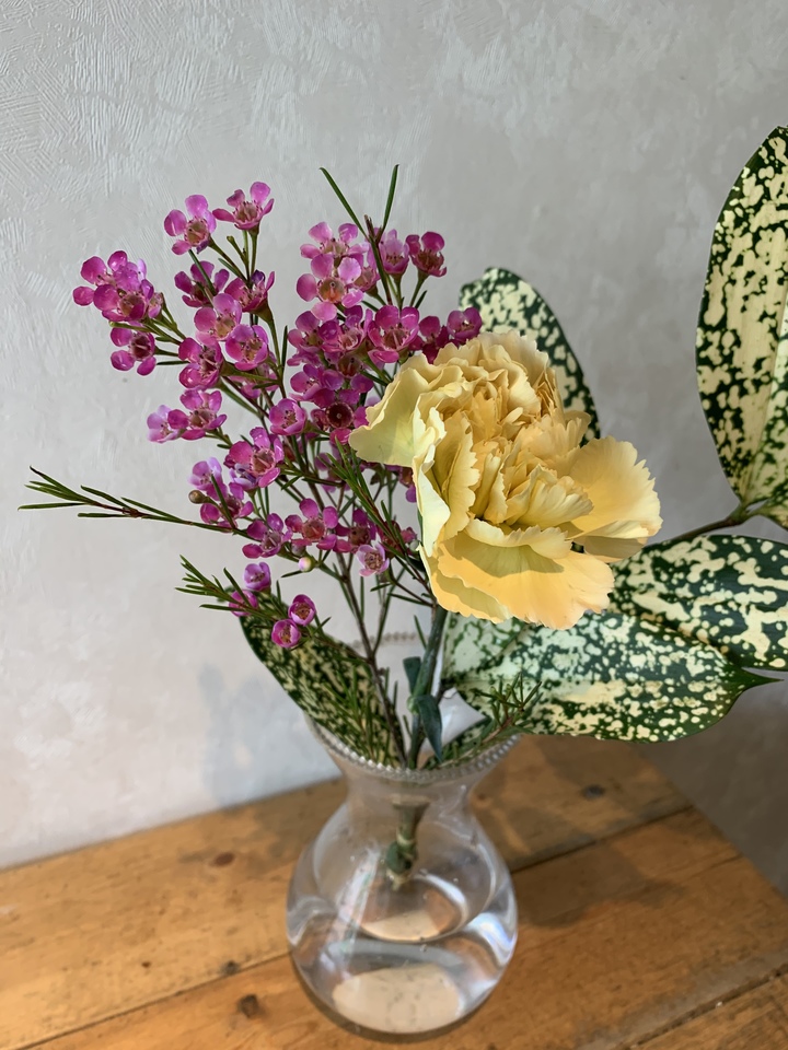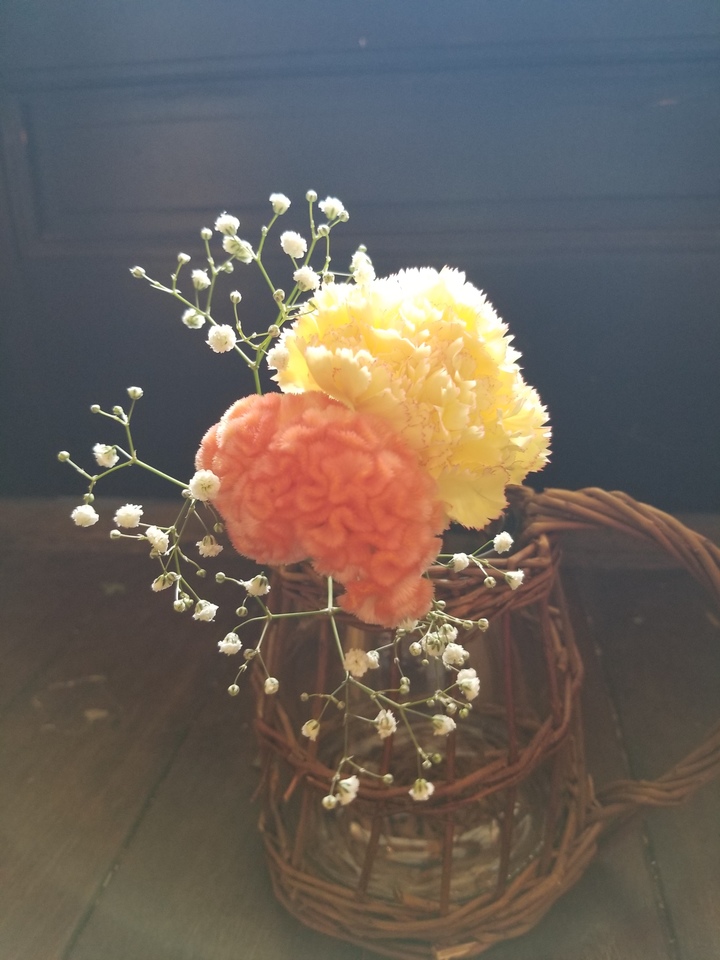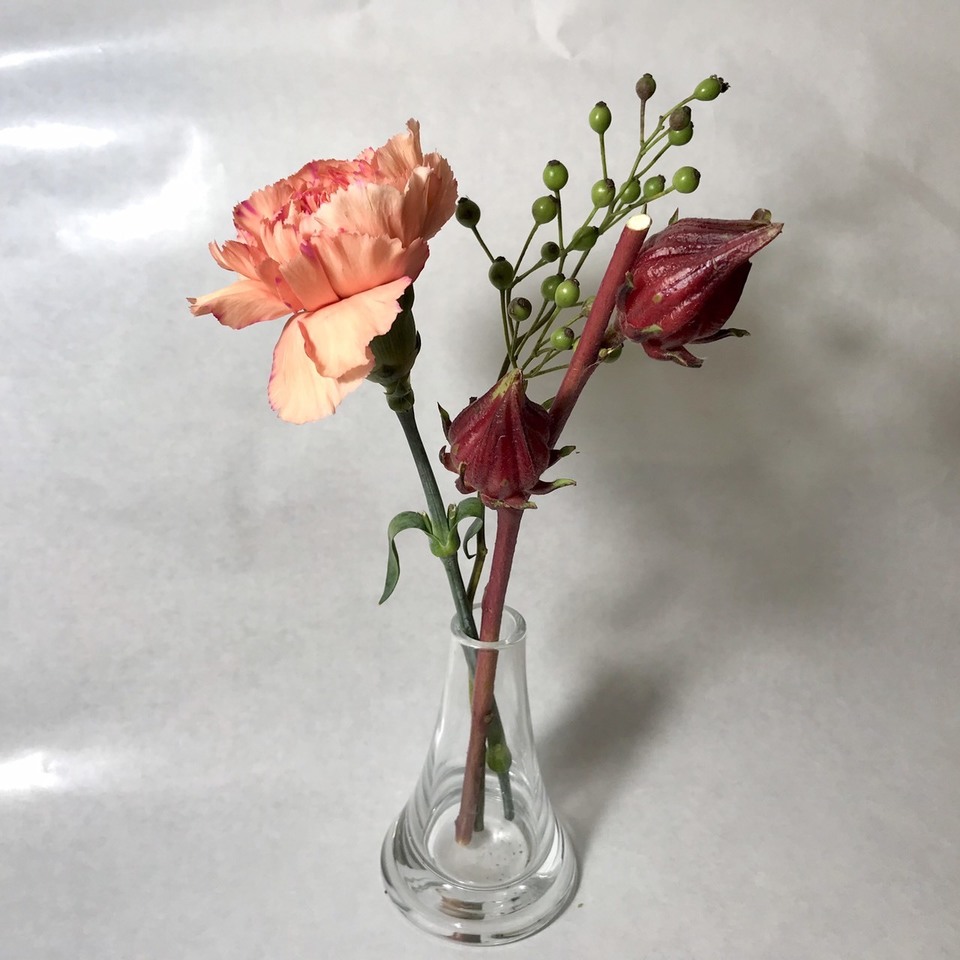 ■お花の特徴、お手入れアドバイス カーネーションが硬く閉じた状態の場合、しばらくすると咲いてきます。花びらが柔らかくなったら優しく手で開いてあげてもいいです。 ヒペリカムは葉が傷んだら取り除き、実だけにして長く楽しめます。ステムはまっすぐカットして、縦に割りを入れると良いです。 お水は花瓶半分くらい、多すぎないように管理して下さい。