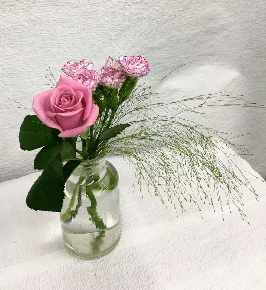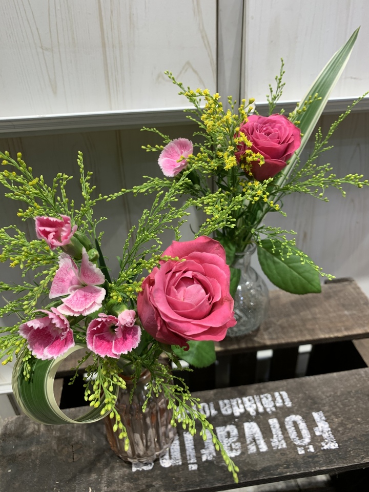 ■テーマ、アレンジに込めた想い ピンクのバラと可憐なナデシコのアレンジ