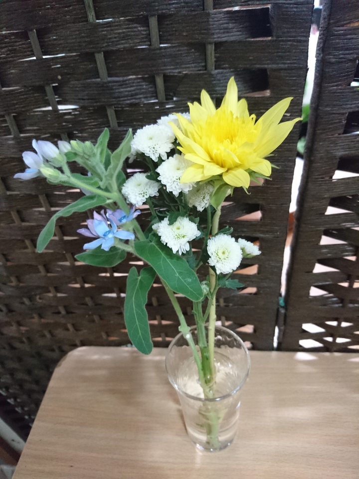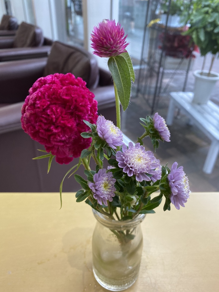 アスターは繊細な花で蒸れやすいので、葉っぱは早めに取っておいてもいいでしょう。千日紅は水切りして水が上がりやすいようにしてください。