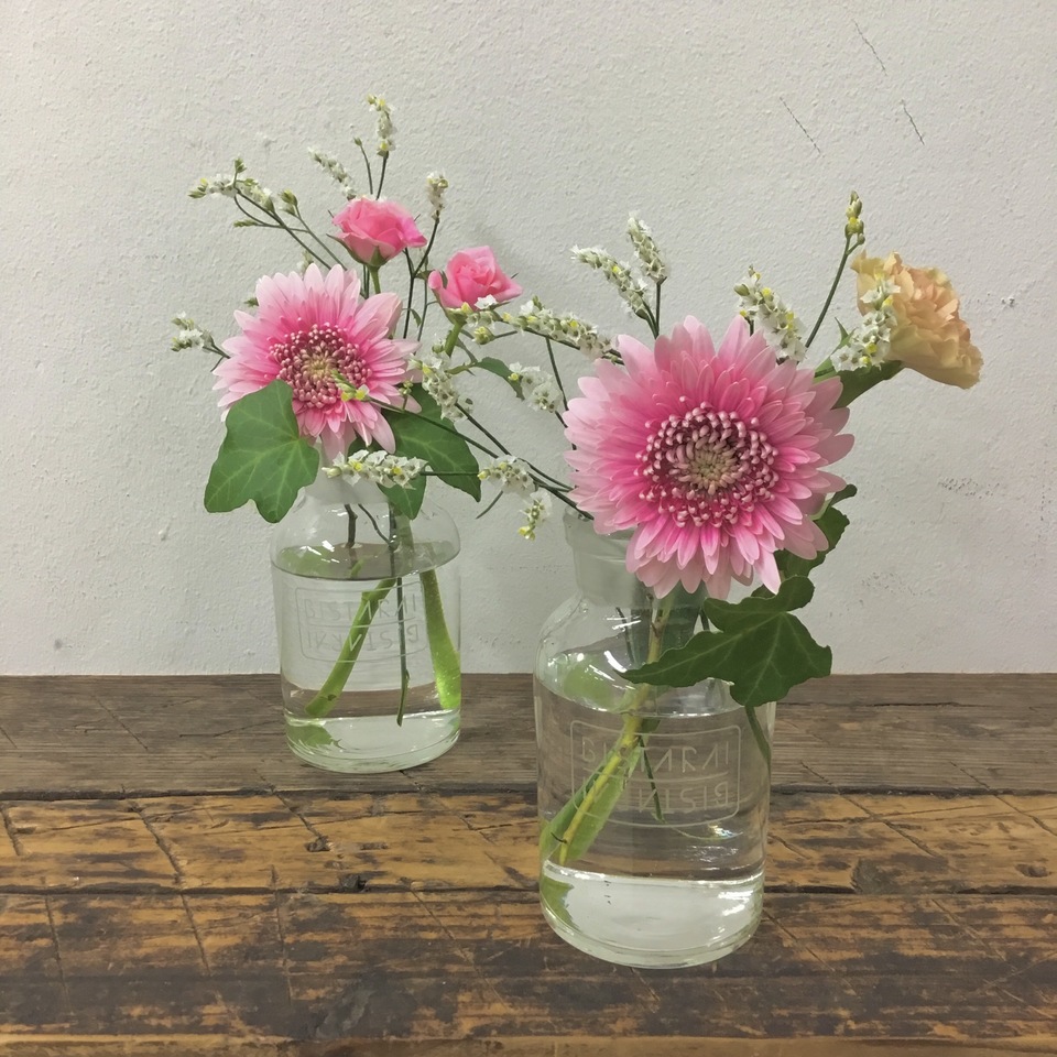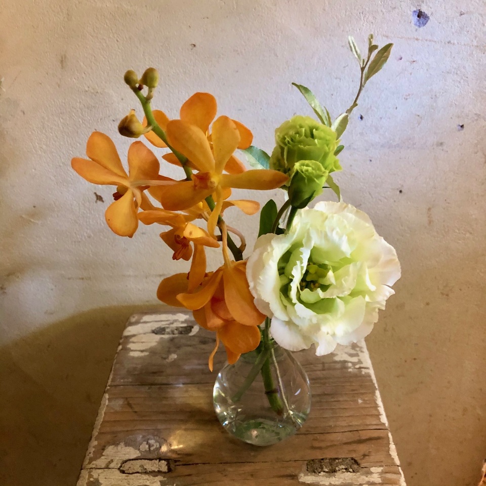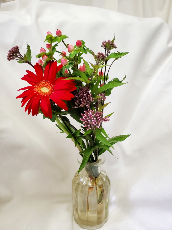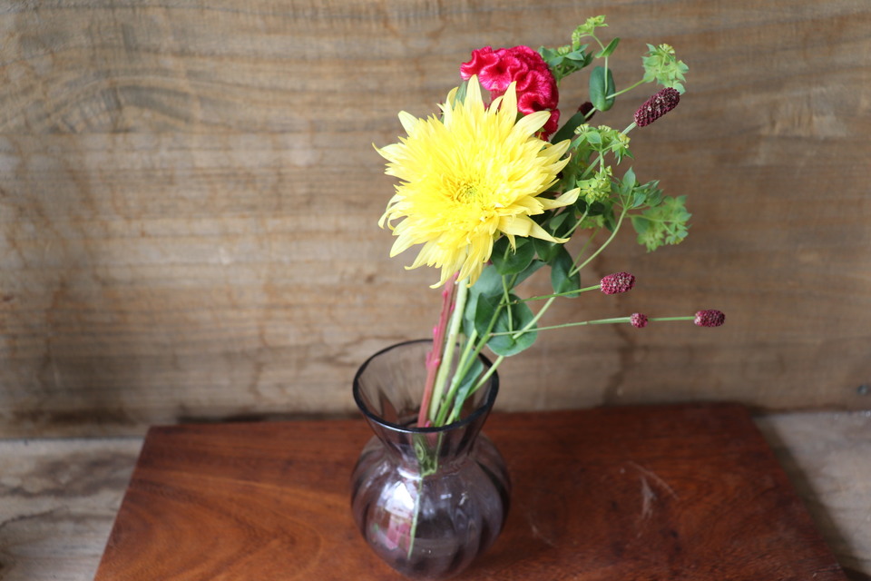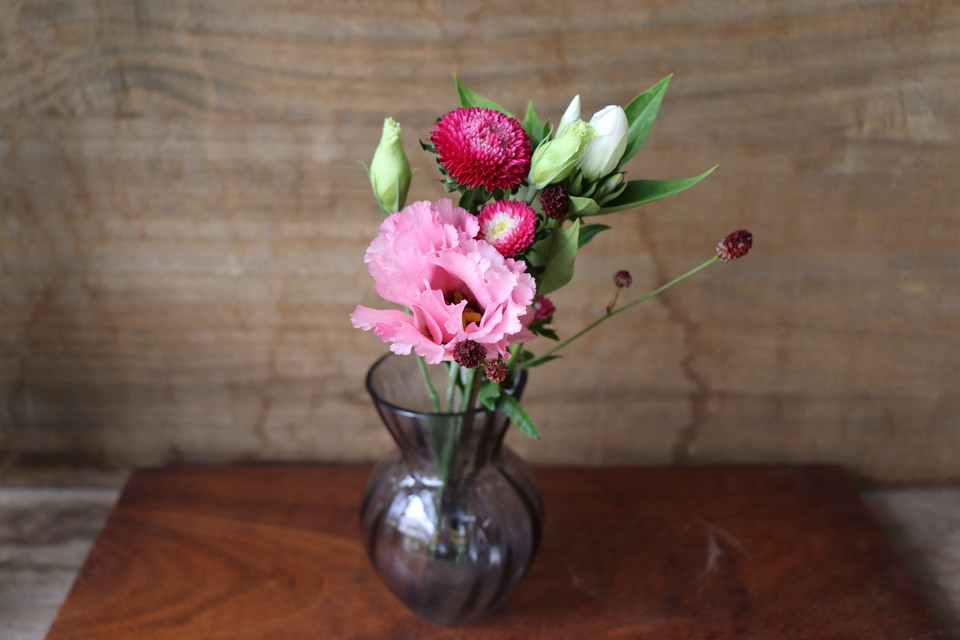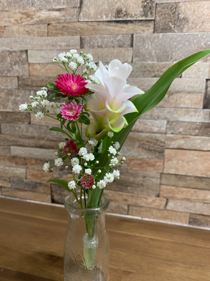 個性的な花びらのガーベラです。優しい色合いのアスターとコロンとかわいらしい千日紅をのびやかにいけてみてください。ナルコランのはっぱも色がとても綺麗で爽やかですので、葉の表が見えるようにいけてみてください。