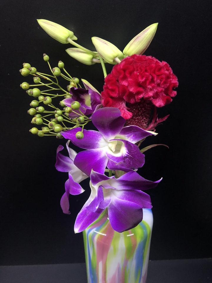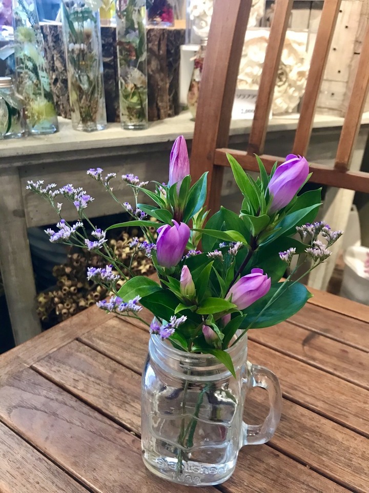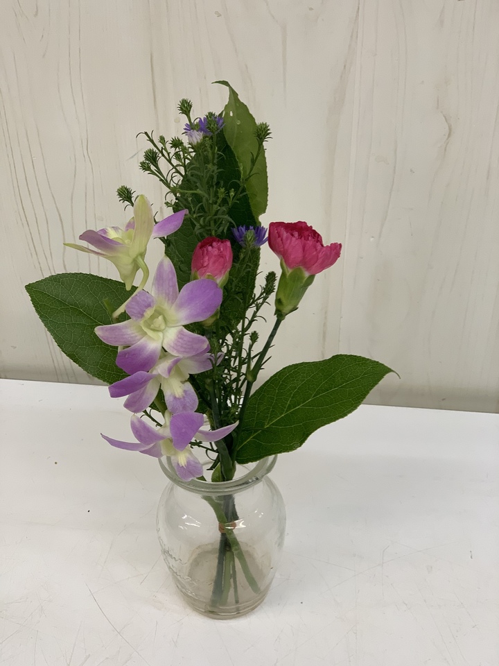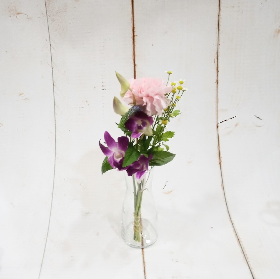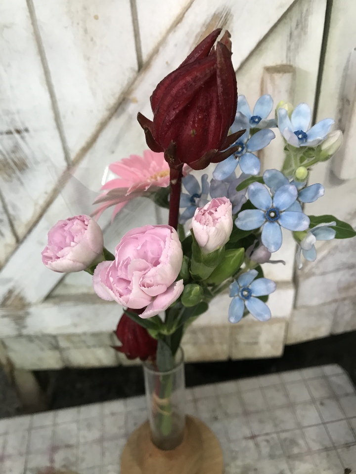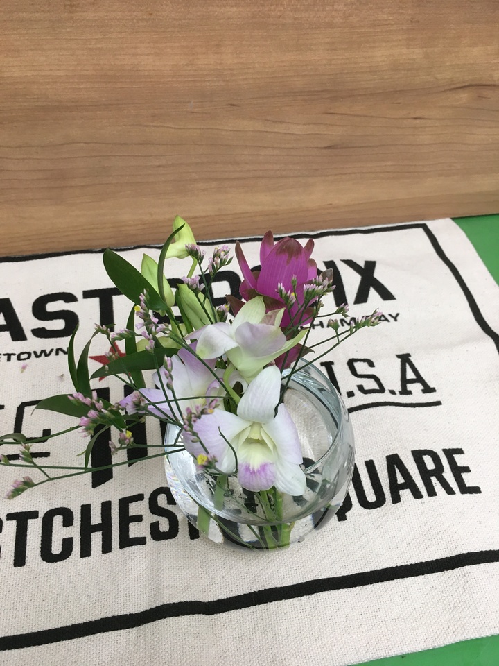 個性的な花びらのガーベラです。優しい色合いのアスターとコロンとかわいらしい千日紅をのびやかにいけてみてください。ナルコランのはっぱも色がとても綺麗で爽やかですので、葉の表が見えるようにいけてみてください。