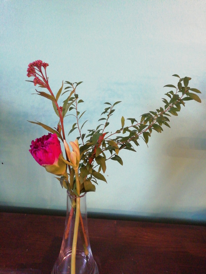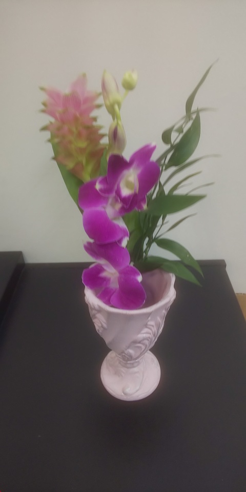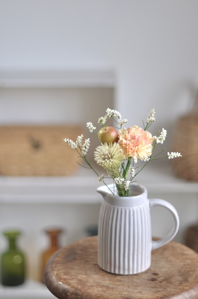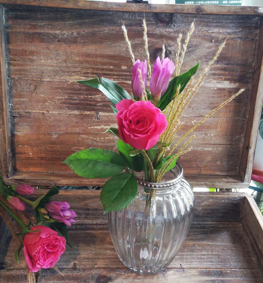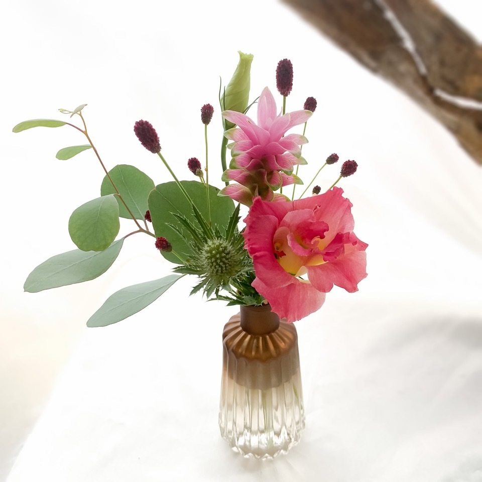 スプレーバラ・ガーベラは花びらを触ってみて張りがなければ茎を1センチ~2センチ切って再度水揚げしてください。ミスカンサスはペンや指に巻き付けてクルクルのクセを付けて活けるとまた違った表情を見せてくれます。