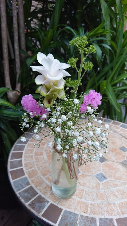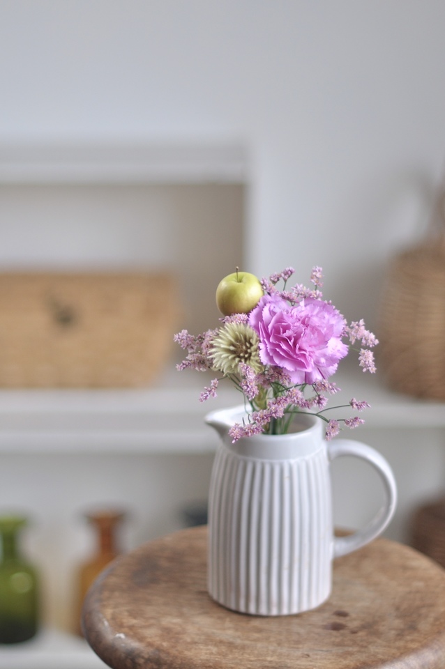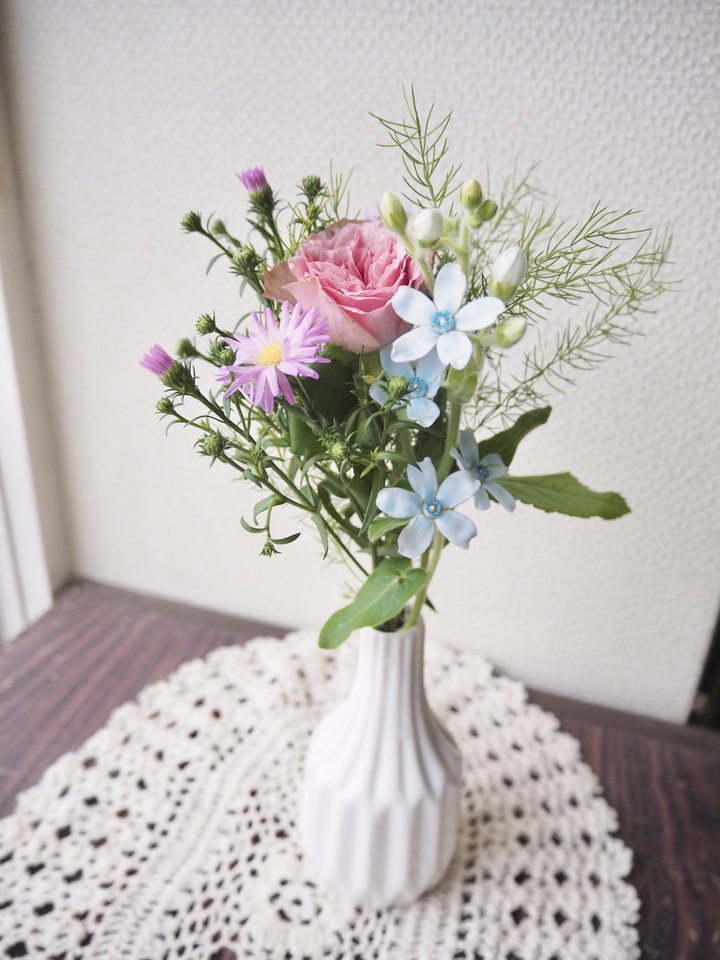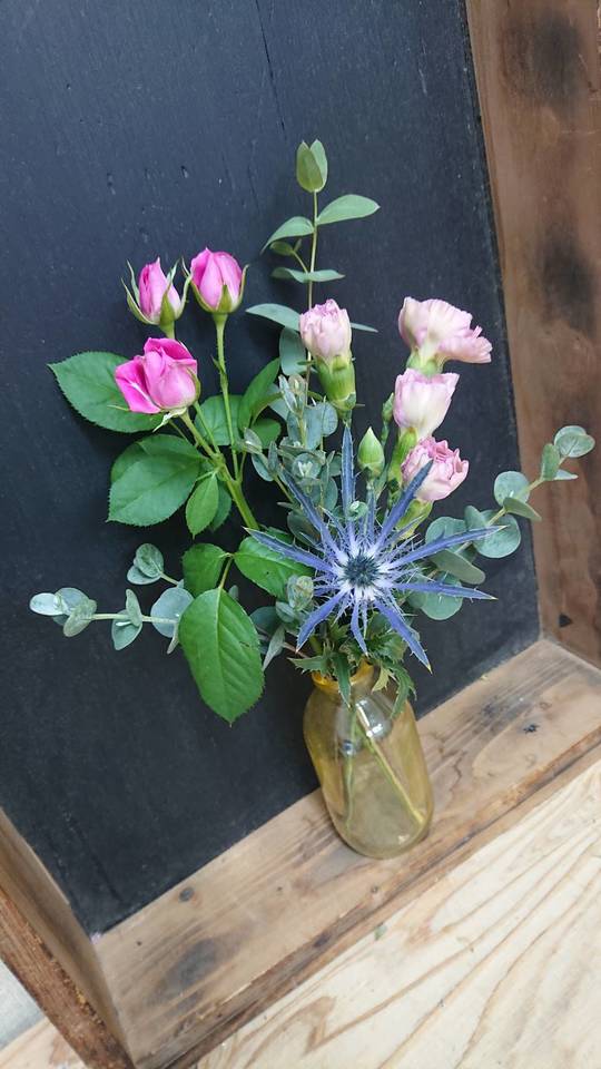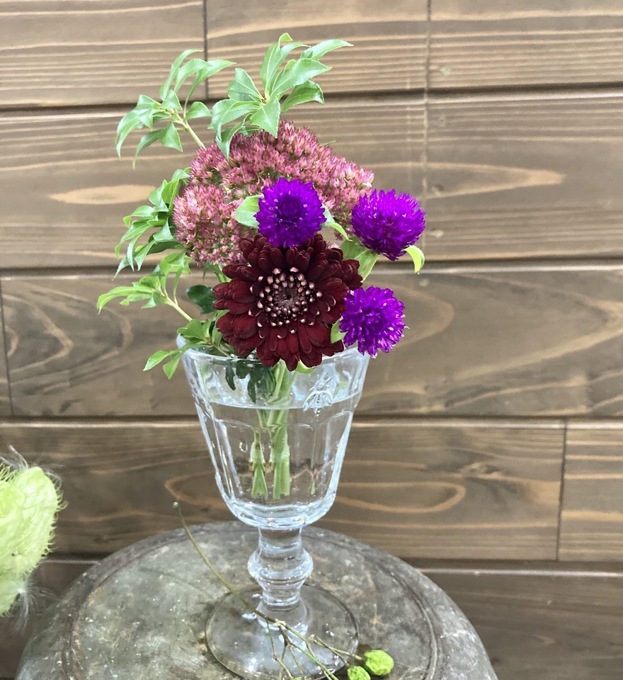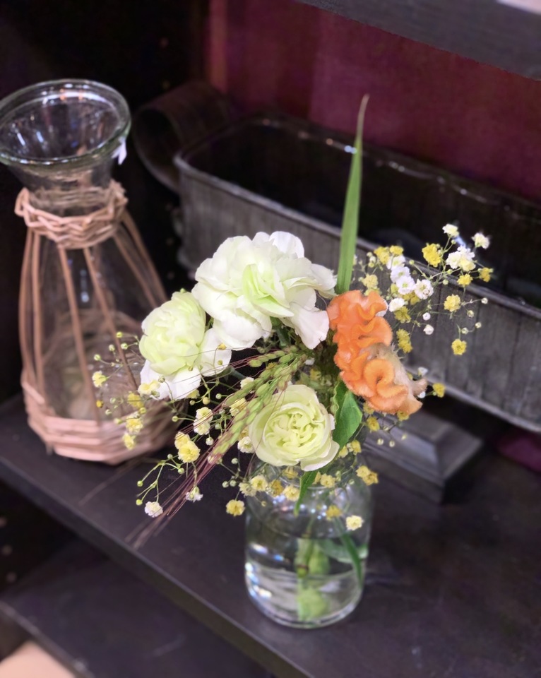 落ち着いた色合いの花にクジャクソウを入れて可愛い感じに仕上げてみました♪