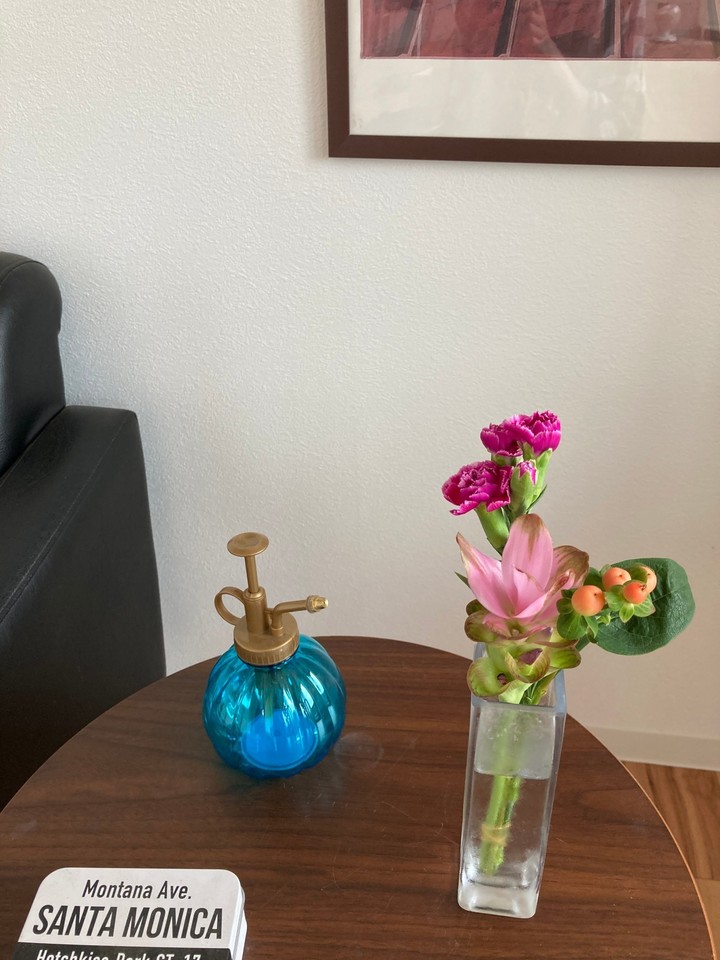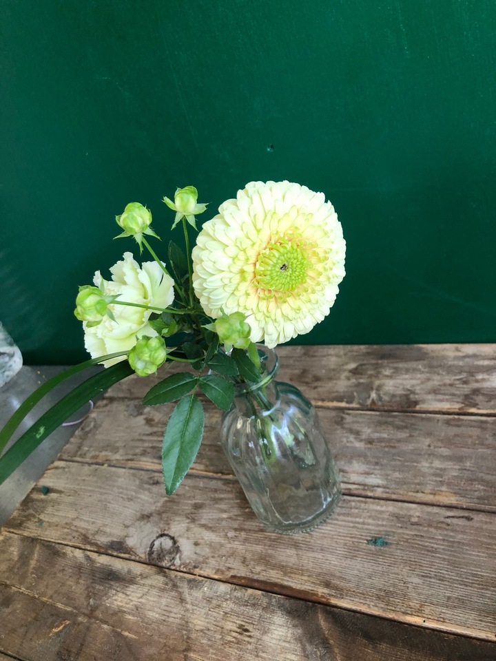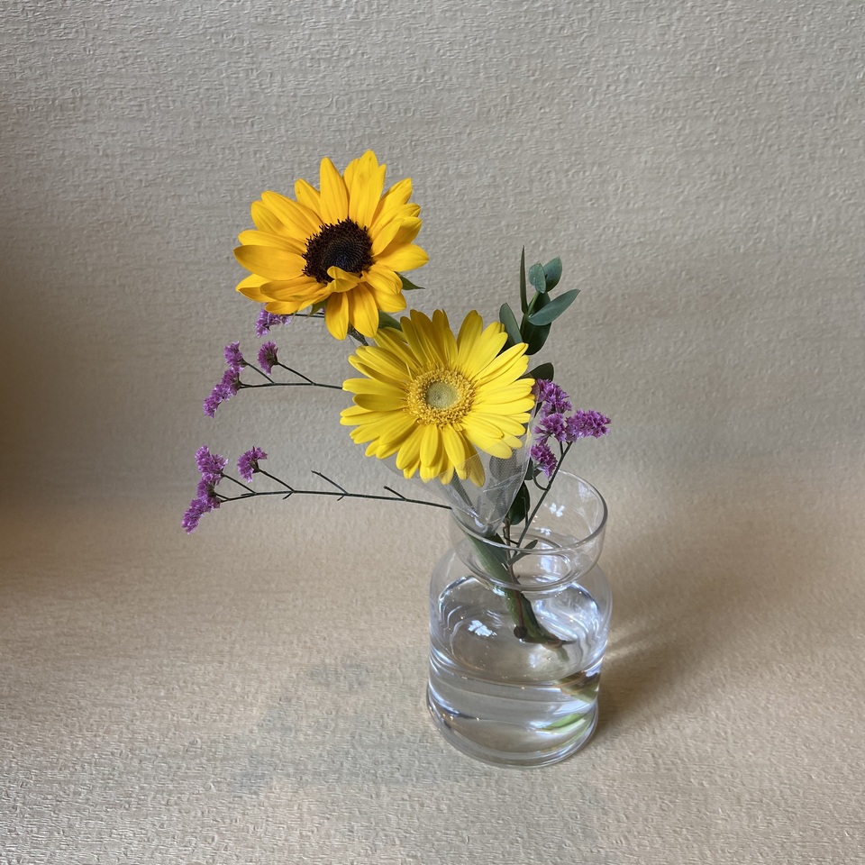 @花束は長旅で少し疲れて届くこともありますので水切り後多めの水でたっぷりと水揚げをしてからお気に入りの花瓶に少し少なめの水で管理しましょう。 まだまだ暑いので水替えは毎日こまめに行いましょう。