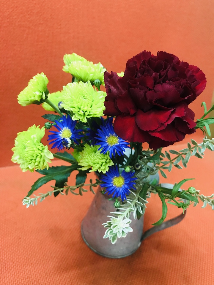 スプレーマムのフレッシュなグリーンと人気のダークレッドのカーネーション、シャビーなグリーンにポイントで紫の宿根アスターをあしらいました。