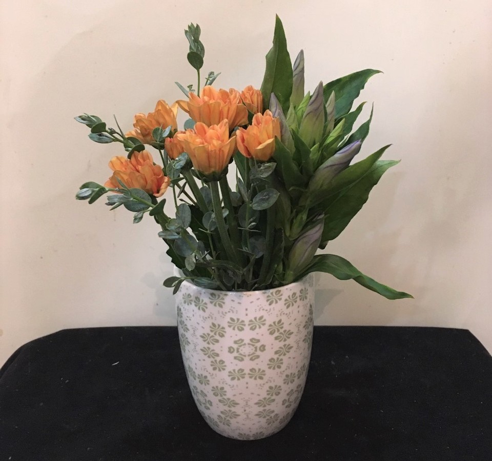 @「スプレーカーネーション」はギザギザの花弁と淡いグリーンの色彩がオレンジやイエローと合ってますよね。 花弁が内側に丸くなってきたら終わりのサインです。さらに変色して枯れてきたら切取りましょう。