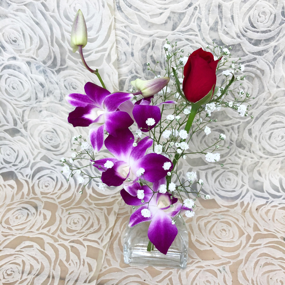 ■お花の特徴、お手入れアドバイス キキョウランの葉を丸めて飾るのも素敵です! バラの棘は取っていますが、葉の裏にも棘があるかもしれないので気をつけてください。