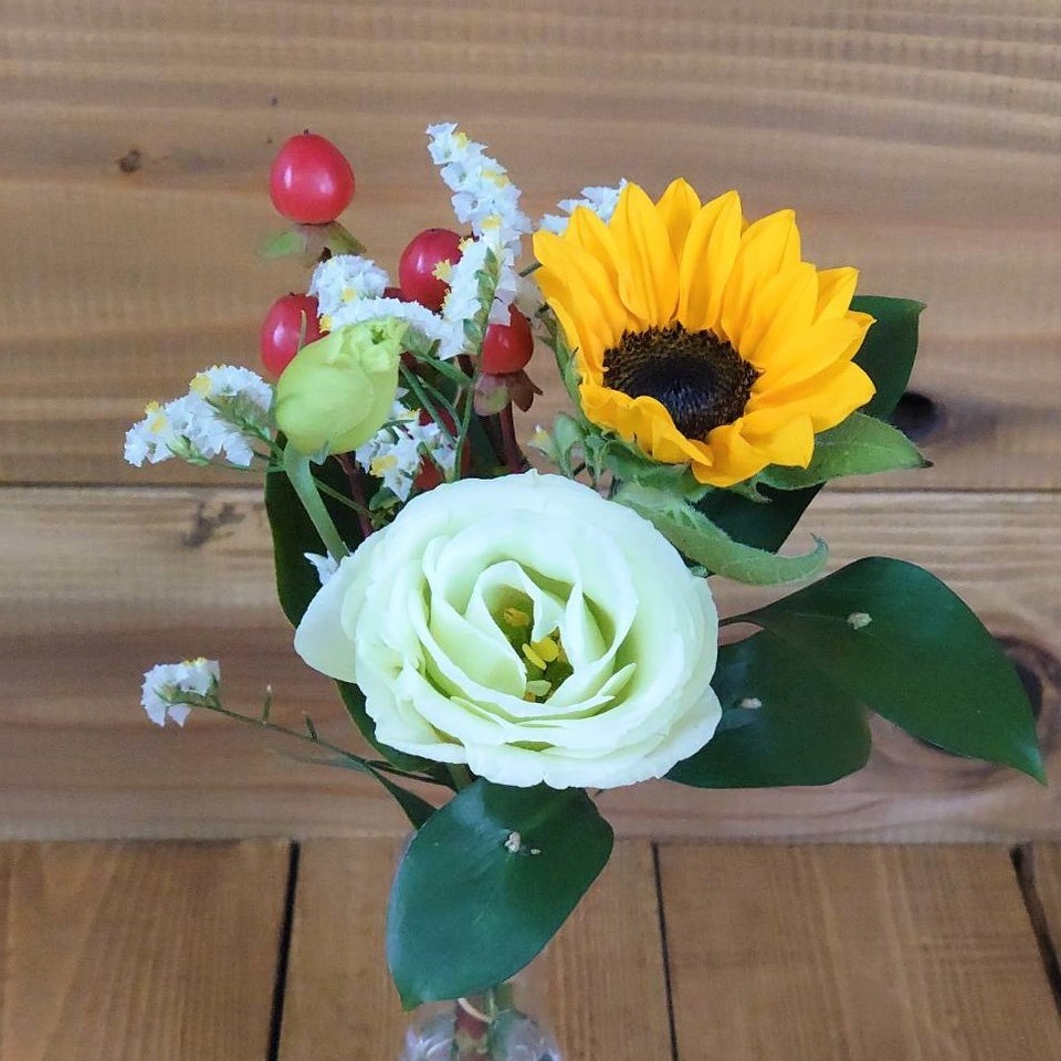 ■お花の特徴、お手入れアドバイス トルコキキョウは花びらが繊細なお花です。 配送中に形が崩れてしまっていることがありますが、水揚げの際に手でそっと直していただくと綺麗に飾れます。 ひまわりは花の茎の根本から1〜2cmを斜めに切り、茎が水に弱いので少なめの水で良いです。 ヒペリカムは茶色く変色してきたら、一つずつ根元の部分からはさみで取り除いてあげてくださいね。