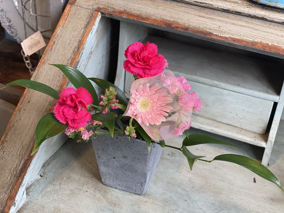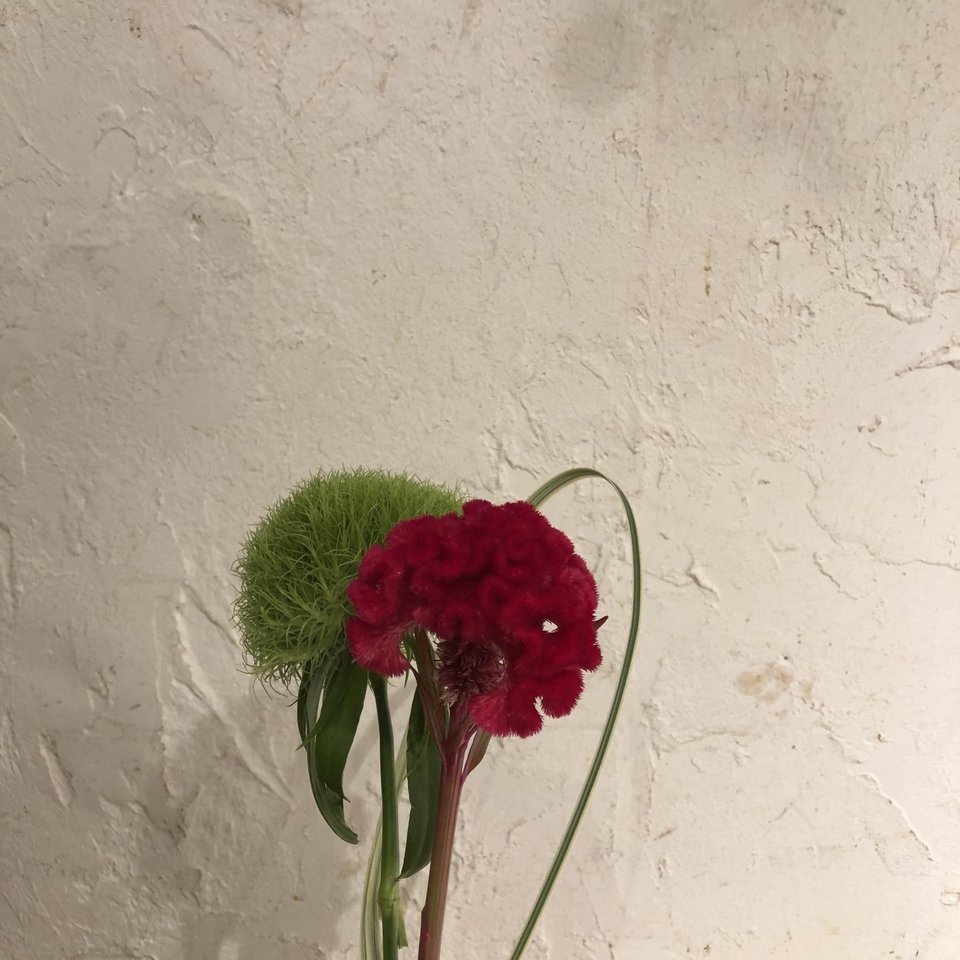 ■お花の特徴、お手入れアドバイス メインのスプレーマムは、菊科ですので長く楽しめる人気の花材です。ポイントのダークレッドのカーネーションはこれからの季節にその色目と存在感、花持ちの良さで人気の花材です。 ウエストリンギアはデリケートな植物ですが、シャビーな色味と独特の存在感で、空間をあしらってくれます❤︎ また孔雀草とも呼ばれる宿根アスターは、大分県産でみずみずしいですが、花持ちはよいのですが大きな葉が先に痛みやすいので、気になる場合は先に取ってしまってもよいでしょう。